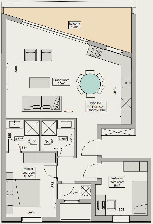 The finish includes high-quality parquet flooring and fully finished bedrooms, living rooms, shower rooms, bathrooms, washrooms, fitted kitchen, and an air conditioning unit in each room.