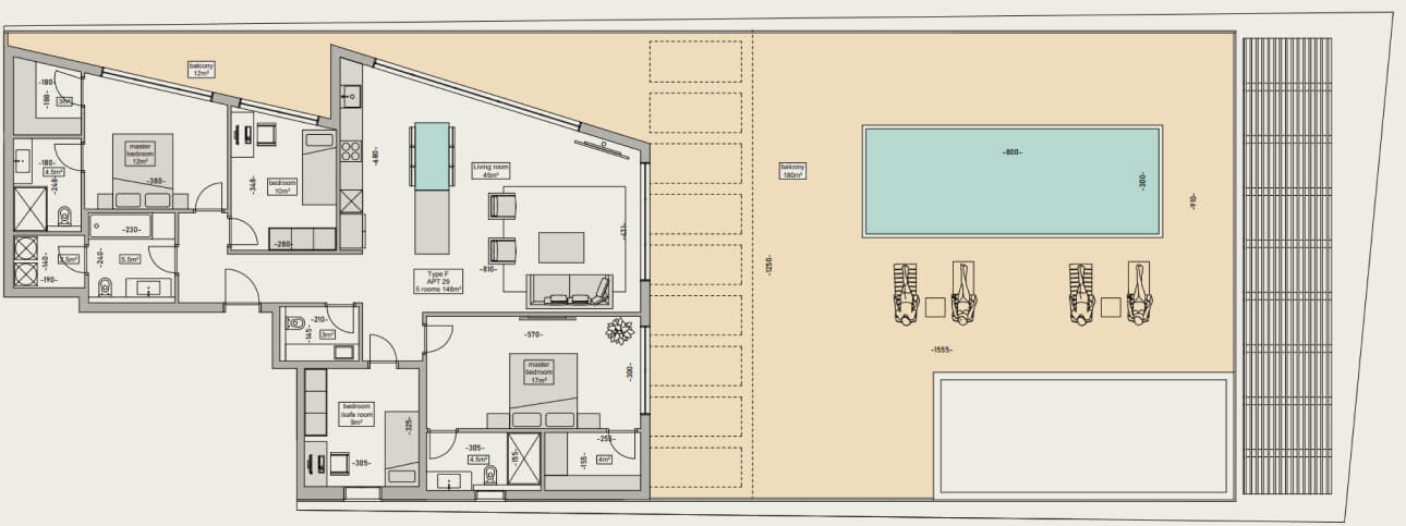 The finish includes high-quality parquet flooring and fully finished bedrooms, living rooms, shower rooms, bathrooms, washrooms, fitted kitchen, and an air conditioning unit in each room.